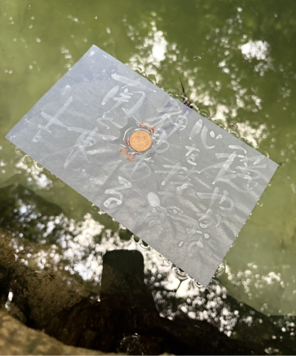 池に和紙を浮べ、硬貨をそっと乗せるとーーー紙はしばらくの間水面に漂い、遠くの方で静かに