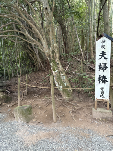 多くの方々が参拝に訪れており、この地がいかに人々に親しまれている場所であるかを実感しました。鏡の池へ向かう途中、「夫婦椿(めおとつばき)」と呼ばれる不思議な椿の木が祀られています。